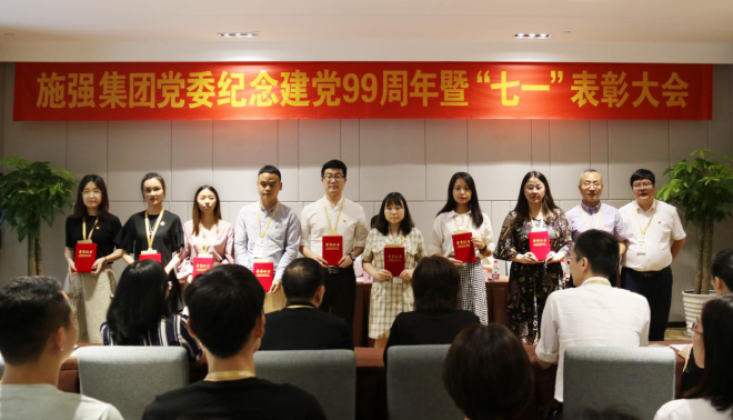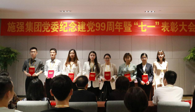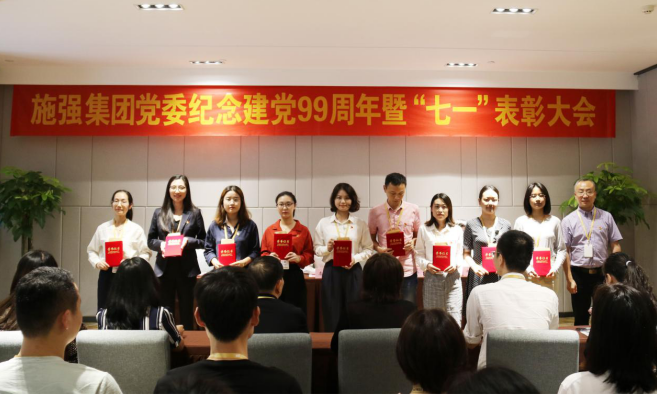 2020年7月1日,施强集团党委纪念建党99周年暨“七一”表彰大会在施强广场隆重举行。集团党委书记、董事长虞陆平,集团党委委员以及各党(总)支全体党员,以现场和乐课网两种形式参加了大会。大会由集团党委委员顾晓倩同志主持。