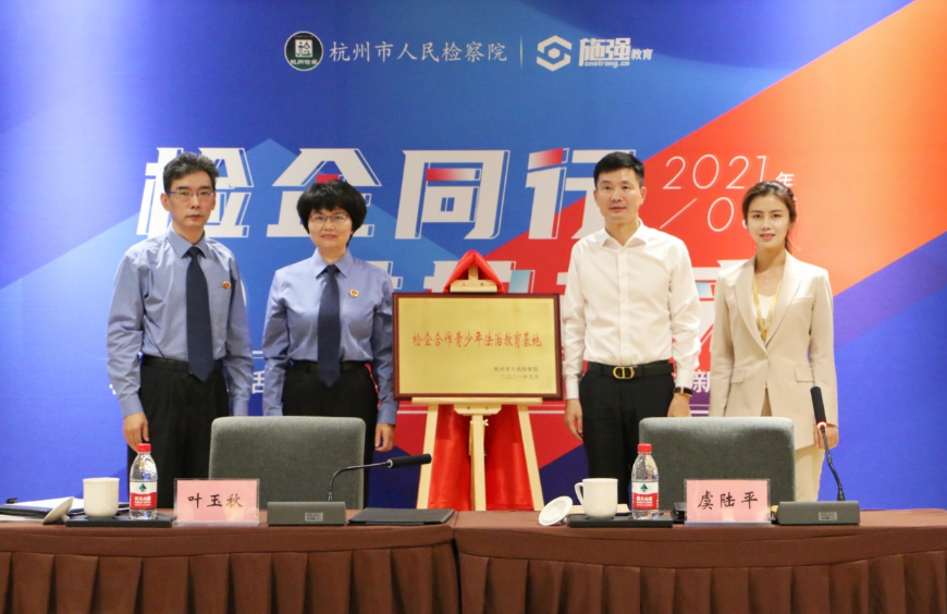 在全体参会人员的见证下,叶玉秋副检察长和虞陆平董事长共同签署了杭州市人民检察院与施强教育的战略合作协议,并为“检企合作青少年法治教育基地”揭牌。随后,双方共同发布了《“未”来说法青少年在线法治教育课程》。