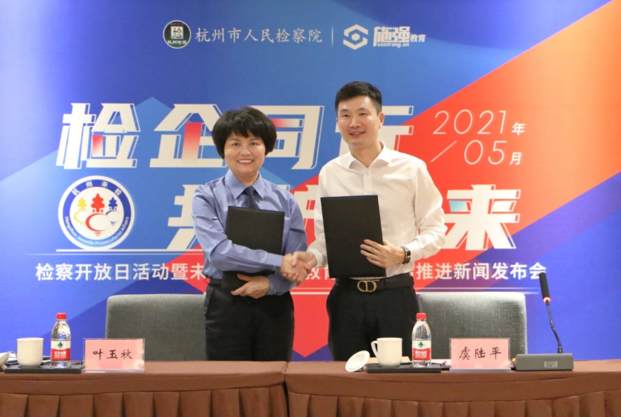 5月20日,杭州市人民检察院2021年“检企同行·共护未来”检察开放日暨未成年人法治教育工作总结推进新闻发布会在施强广场隆重举行。在会上,杭州市人民检察院与杭州施强教育科技有限公司签署战略合作协议,正式揭牌成立浙江省首个市级检企共建青少年线上法治教育基地。